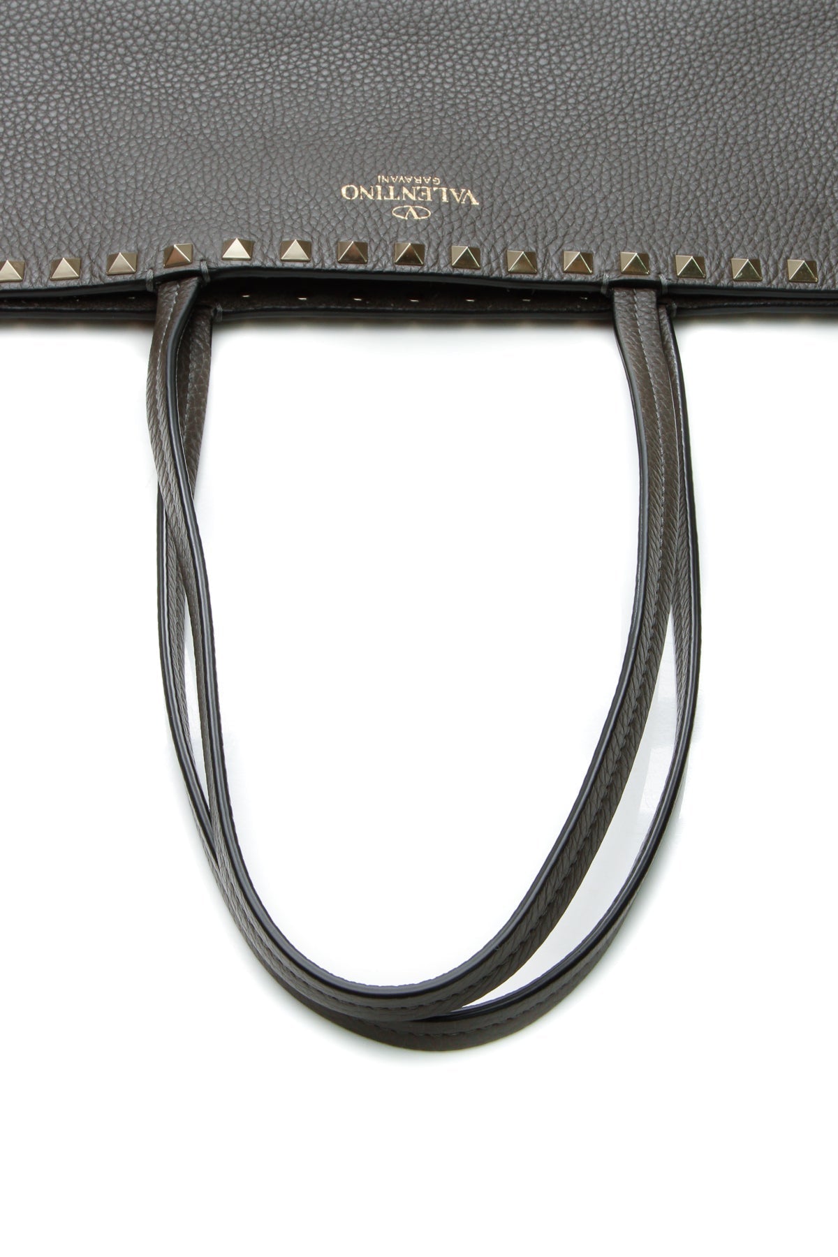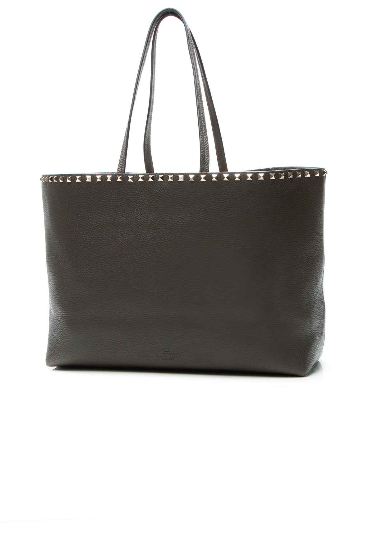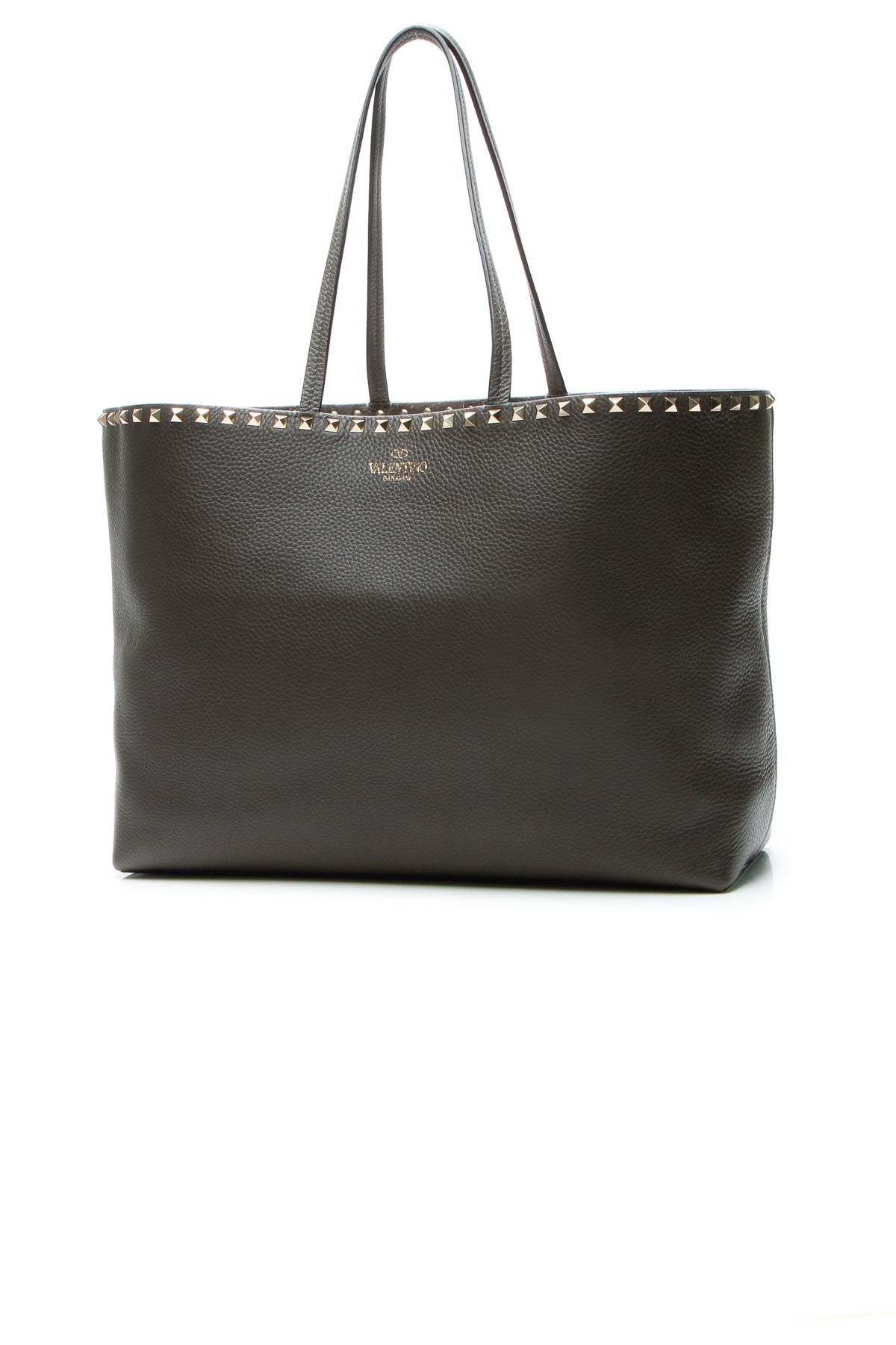 Elegant meets edgy in this authentic Valentino Rockstud tote. In this instantly-recognizable bag, gold-tone studs line a sumptuous gray leather silhouette lending that signature Valentino appeal to this pretty piece. A roomy interior provides the quintessential space for both personal and professional essentials alike.
