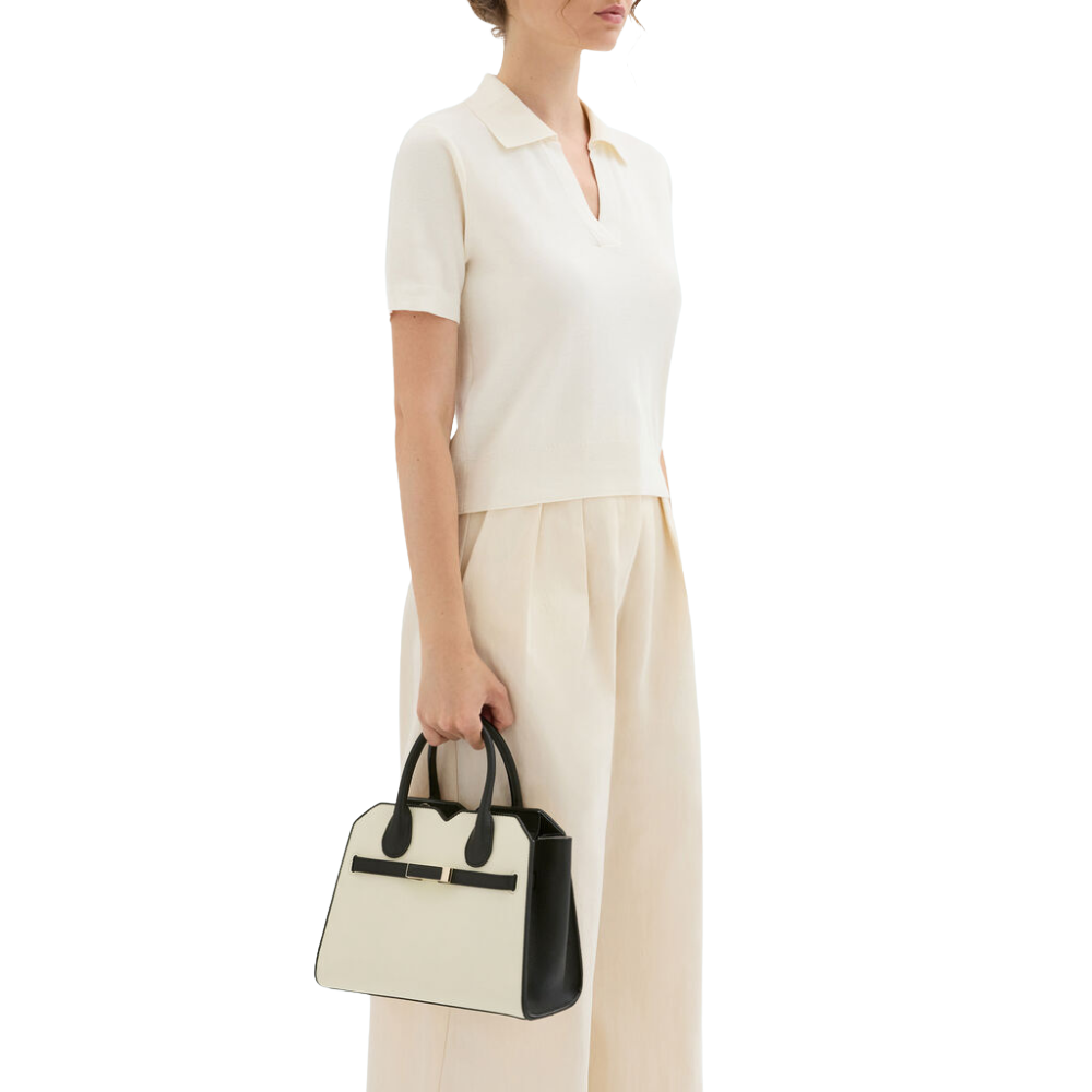 The Sivana Chiaroscuro Two Handles Mini handbag in contrasting Pergamene white and black is an exquisite ode to Milanese elegance. Crafted from our Millepunte Soft leather, it has several Sivana signatures. Framed by our handpainted black lacquered Costa edging, its clasp takes its cue from our iconic I-side handbag while its belt adjusts to alter capacity. Inside, there is space for a 10.9-inch iPad, with two additional pockets to keep valuables secure. Equipped with a belt that adjusts its capacity and an adjustable strap to complement the comfortable top handles, it’s an everyday essential meets statement piece.